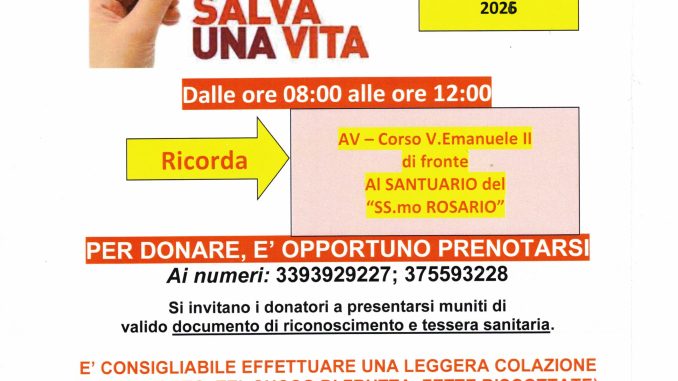 Domenica 22 Febbraio 2026, dalle 8:00 alle 12:00, la Consociazione Regionale Gruppi Donatori di Sangue “Fratres – Campania ODV”, insieme al Gruppo Fratres Avellino ODV, promuove una nuova giornata dedicata alla donazione del sangue. L’appuntamento è in Corso Vittorio Emanuele II, di fronte al Santuario del Santissimo Rosario: un punto centrale della vita civile e religiosa della città, scelto per favorire la partecipazione di tutti.