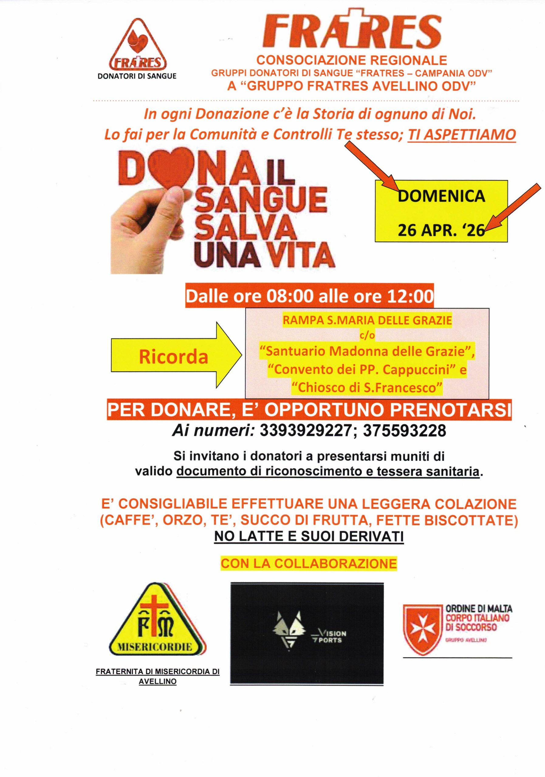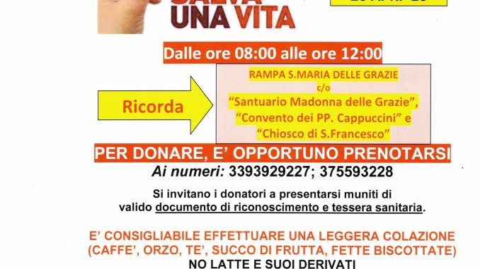 Domenica 26 aprile 2026, dalle 8:00 alle 12:00, la Consociazione Regionale Gruppi Donatori di Sangue Fratres Campania ODV, insieme al Gruppo Fratres Avellino ODV, promuove una nuova giornata dedicata alla donazione del sangue. L’appuntamento è presso la rampa di Santa Maria delle Grazie, nei pressi del Santuario Madonna delle Grazie, del Convento dei Padri Cappuccini e del Chiosco di San Francesco: un luogo significativo della vita cittadina, scelto per favorire la partecipazione di tutti.