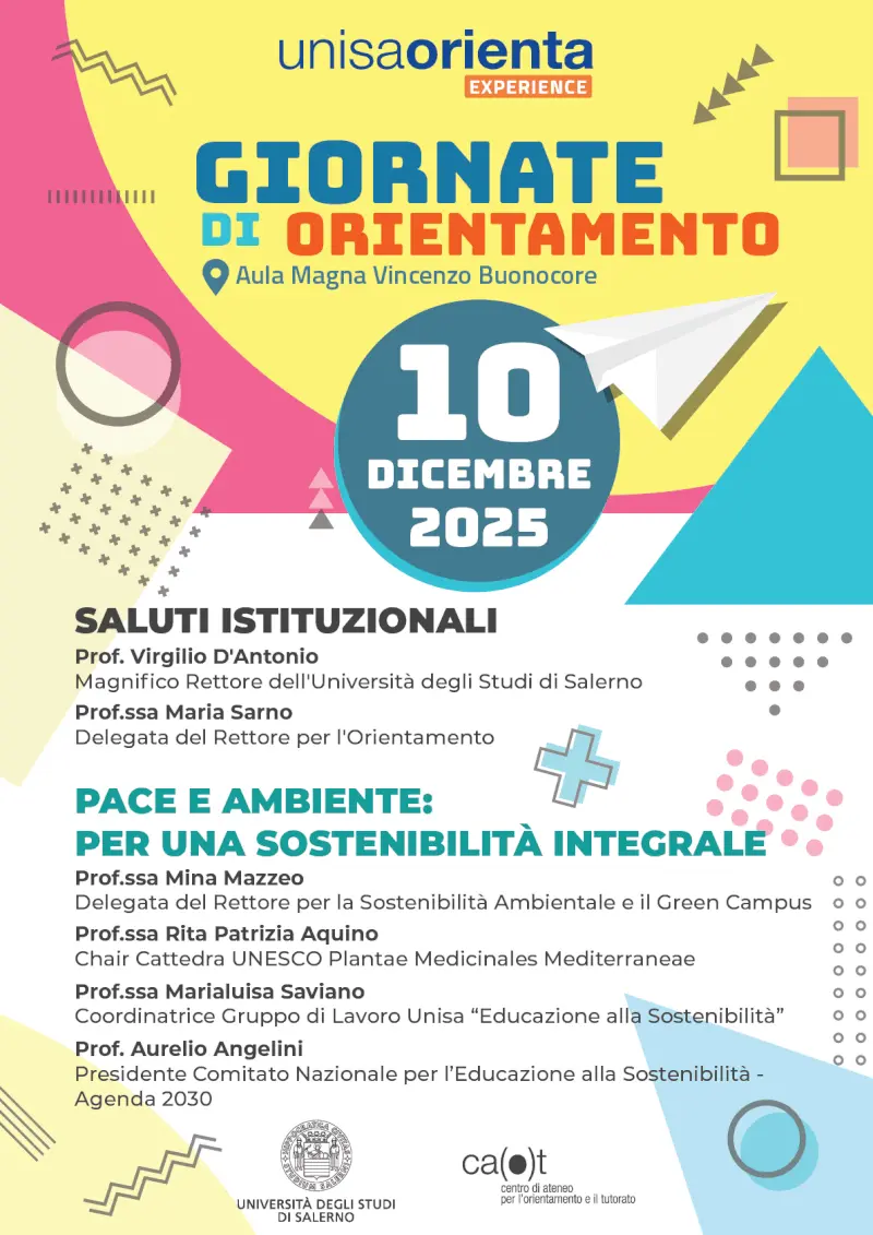 L’Università degli Studi di Salerno apre le porte agli studenti e alle studentesse degli Istituti Scolastici Superiori per le prime tre giornate di “UNISAOrienta Experience”, il programma di orientamento alla futura scelta universitaria, promosso lungo tutto l’anno dal Centro di Orientamento e Tutorato di Ateneo (CAOT), per le aspiranti matricole.