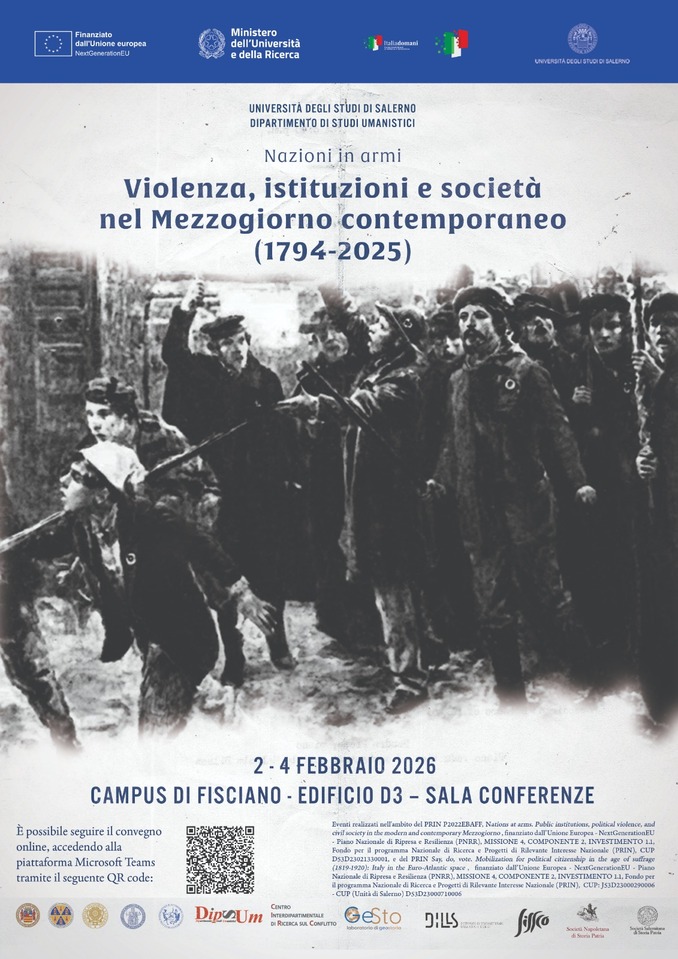 Dal 2 al 4 febbraio 2026 si terrà al campus di Fisciano, presso la Sala Conferenze–Edificio D3, il Convegno dal titolo “Nazioni in armi. Violenza, istituzioni e società nel Mezzogiorno (1794–2022)“, appuntamento conclusivo del progetto PRIN “Nations at Arms. Istituzioni pubbliche, violenza politica e società civile nel Mezzogiorno moderno e contemporaneo”, finanziato dall’Unione Europea in ambito PNRR.
