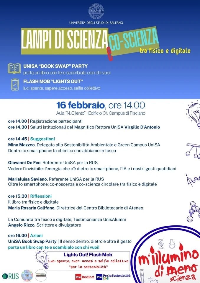 l Campus di Fisciano si prepara a vivere un pomeriggio dedicato alla sostenibilità, alla conoscenza e alla partecipazione attiva con l’iniziativa “Lampi di Scienza – Co-scienza tra fisico e digitale”, organizzata dall’Università degli Studi di Salerno nell’ambito della campagna nazionale M’illumino di Meno. L’appuntamento è fissato per il 16 febbraio alle ore 14.00, nell’Aula “N. Cilento” dell’Edificio C1, dove studenti, docenti e membri della comunità accademica si ritroveranno per un evento che unisce divulgazione scientifica, riflessione culturale e azioni simboliche a favore dell’ambiente.