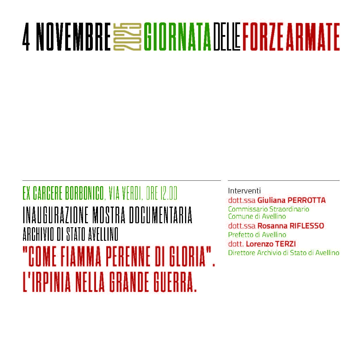 A chiudere le celebrazioni, alle 12:00, sarà l’inaugurazione presso l’Archivio di Stato di Avellino della mostra “Come fiamma perenne di gloria. L’Irpinia nella Grande Guerra”. Questa mostra è un’occasione unica per scoprire come la nostra terra abbia partecipato a quel grande evento che ha segnato profondamente la storia italiana ed europea.