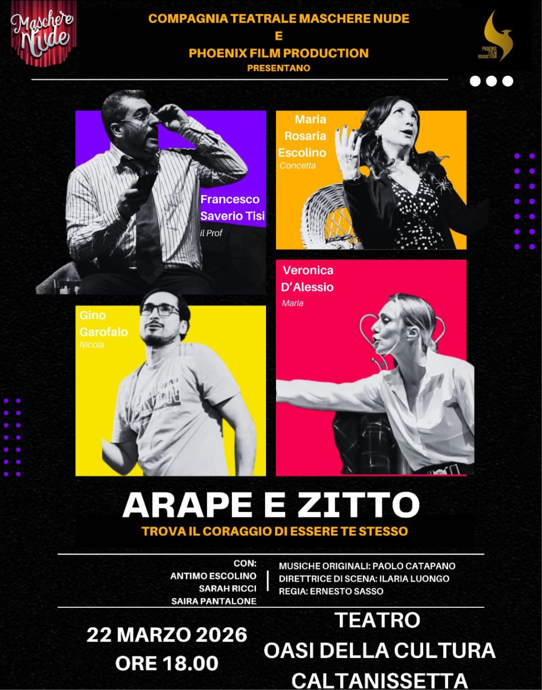 Domenica 22 marzo, presso il Teatro Oasi della Cultura, nell’ambito della rassegna “Domenica Pomeriggio a Teatro” organizzata dal Teatro Stabile Nisseno diretto da Giuseppe Speciale, andrà in scena Arape e zitto, spettacolo d’esordio della compagnia, che ha già raggiunto il traguardo delle trenta repliche in tutta Italia.