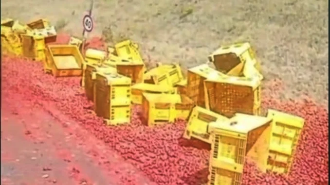 Fisciano (SA) – Incredibile! Un altro TIR di pomodori, scarica il carico in mezzo alla strada. Per fortuna non ci sono feriti.