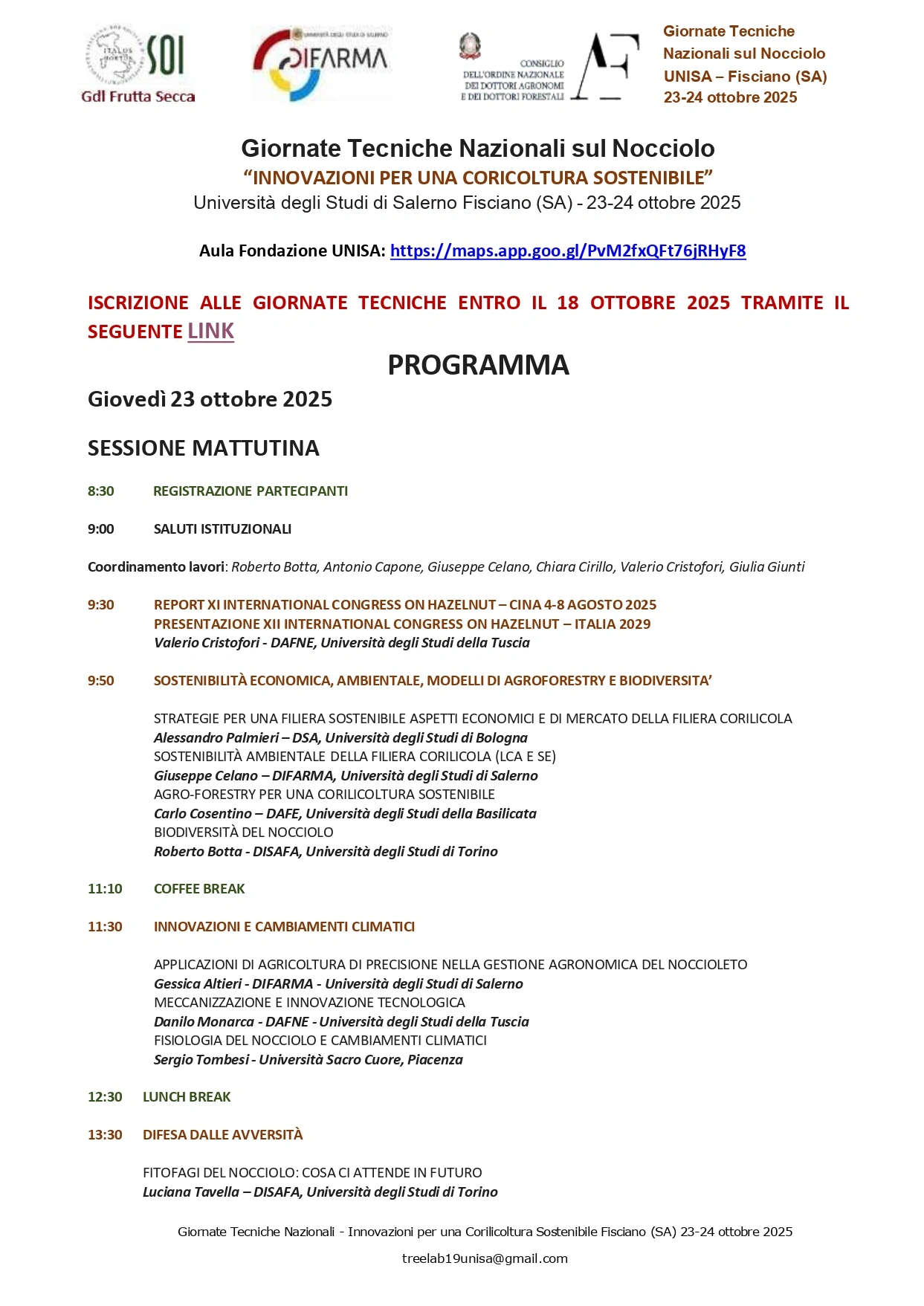 Programma scientifico e tematiche affrontate: la mattinata di lavori ha coperto aspetti di sostenibilità economica e ambientale, modelli di agroforestry, biodiversità, difesa fitosanitaria e impatti dei cambiamenti climatici sulla fisiologia del nocciolo; sono intervenuti ricercatori e docenti provenienti da Atenei nazionali che hanno illustrato studi LCA, strategie di controllo dei fitofagi e applicazioni agronomiche per aumentare la resilienza produttiva.
