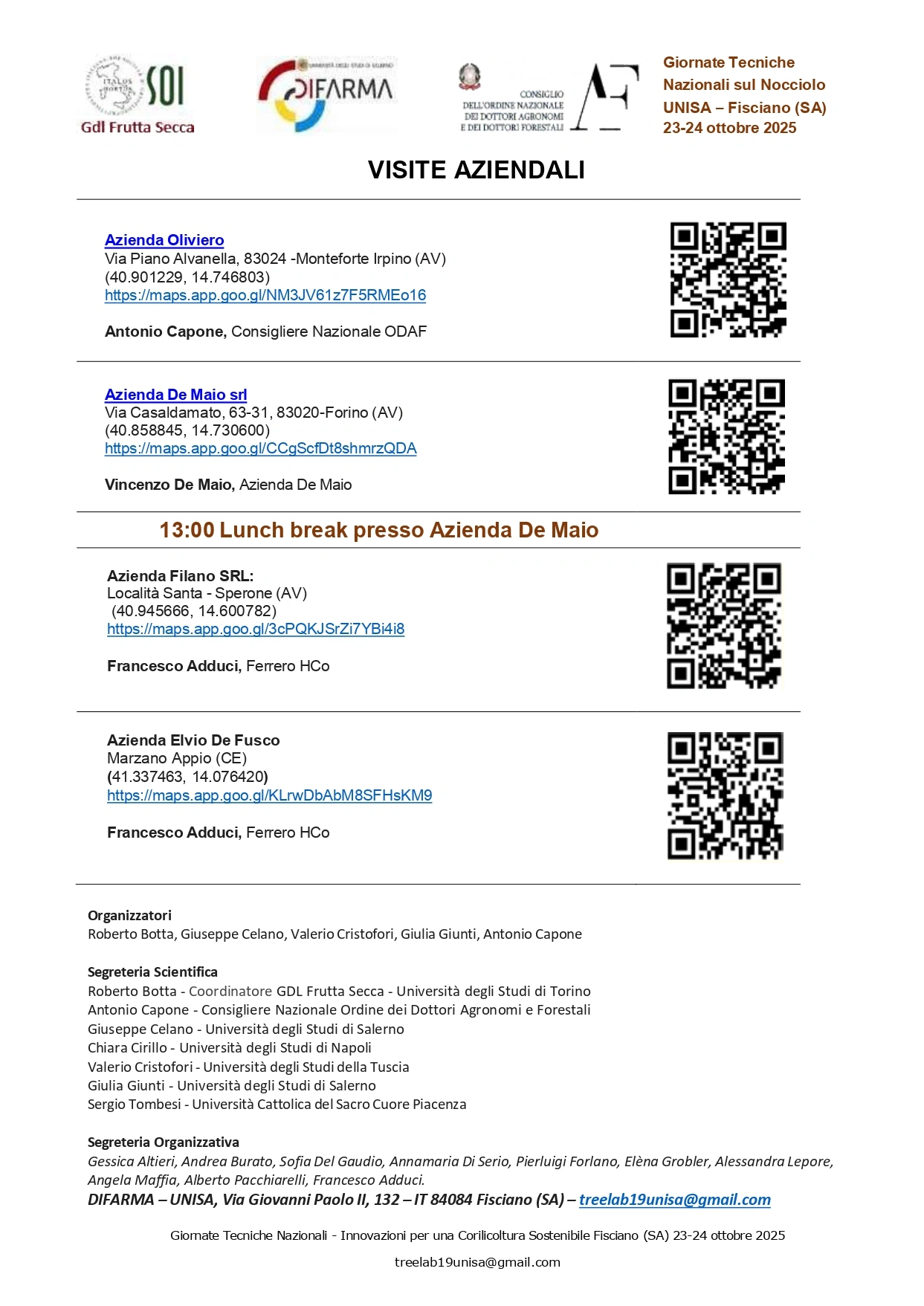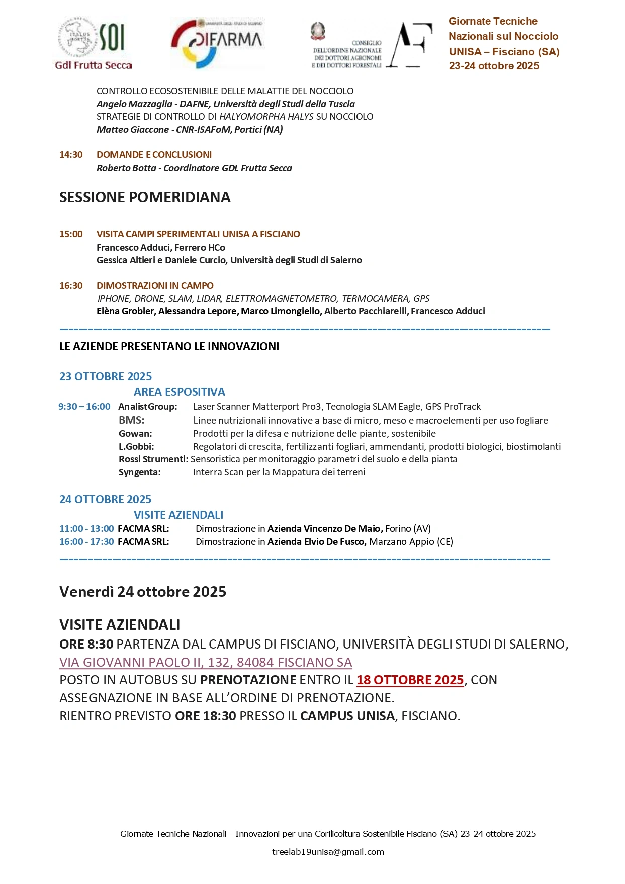 Visite aziendali e casi territoriali: la giornata di visite ha incluso sopralluoghi in noccioleti e strutture di trasformazione e confezionamento presenti in Campania, con tappe programmate presso imprese locali e dimostrazioni in campo finalizzate a mostrare l’applicazione pratica delle tecnologie e delle tecniche presentate a Fisciano.
