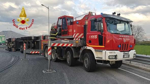 Nel pomeriggio di oggi, intorno alle 15:00, una squadra dei Vigili del Fuoco del Comando provinciale di Caserta, proveniente dal distaccamento di Marcianise, è intervenuta sulla Strada Statale Sannitica, nei pressi del nuovo svincolo autostradale di Maddaloni, per un incidente che ha coinvolto un autoarticolato. Giunti rapidamente sul posto, i Vigili del Fuoco hanno trovato il mezzo pesante, adibito al trasporto di pezzi di ricambio per auto, completamente ribaltato e posizionato di traverso sulla carreggiata, bloccando la circolazione. Le cause dell’incidente sono ancora in fase di accertamento.