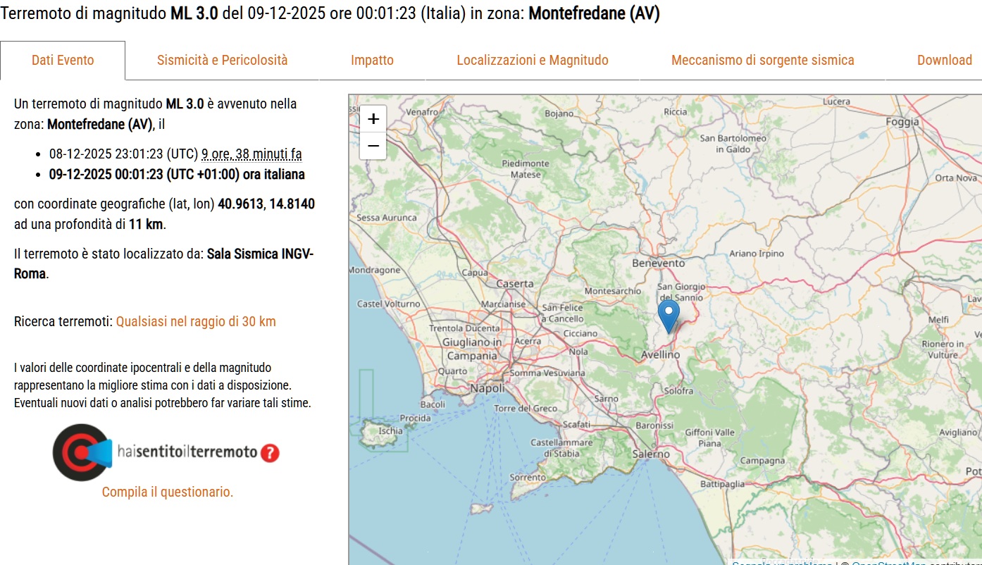 Nella notte tra l’8 e il 9 dicembre 2025, alle 00:01, l’Irpinia ha avvertito una scossa di magnitudo 3.0 con epicentro a Montefredane e ipocentro a circa 11 km di profondità.