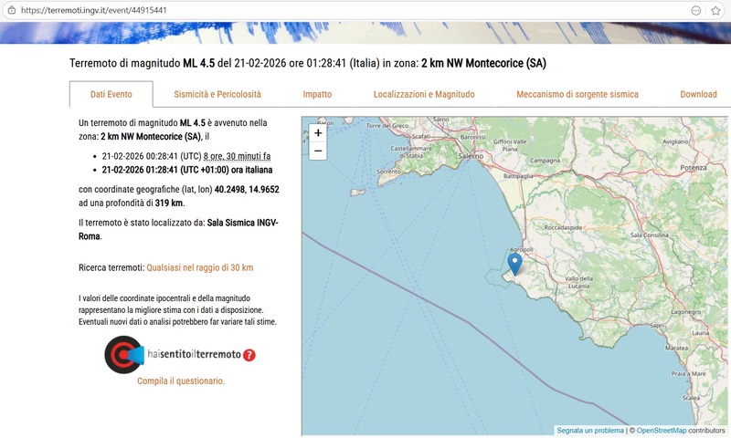 Nella notte appena trascorsa, tra il 20 e il 21 febbraio 2026, alle 01:28, il Cilento è stato interessato da un terremoto di magnitudo 4,5. Si tratta di un valore non trascurabile che tuttavia, nel caso specifico. non ha provocato danni e non è stato percepito in modo particolarmente intenso dalla popolazione. Questo apparente paradosso è spiegato dalla notevolissima profondità dell’ipocentro, stimata in circa 319 chilometri, che ha fatto sì che l’energia sismica si disperdesse in gran parte prima di raggiungere la superficie.