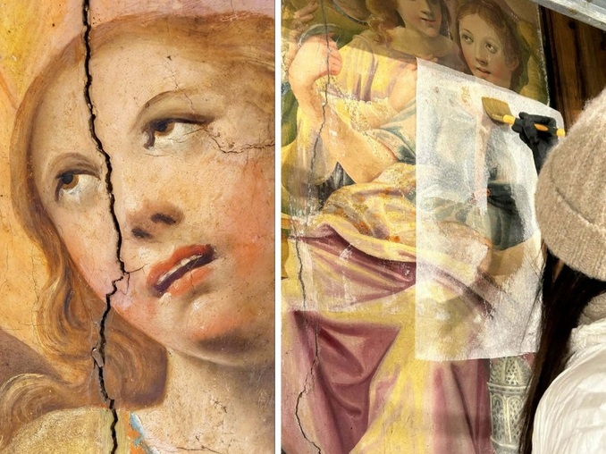 Sono ben visibili delle profonde crepe che corrono lungo tutta l’opera, dove la pittura lascia intravedere il legno sottostante e le muffe che lo hanno aggredito. Uno dei segni inequivocabili che il peso dei secoli lascia sulle superfici e nei legni antichi.