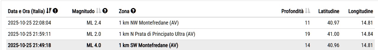 Alle ore 21:49 di oggi, 25-10-2025, a Montefredane c’è stata la scossa finora più forte, pari a 4.0 gradi di Magnitudo. Ad essa sono poi seguite un’altra scossa di 2,4 gradi alle 22:08 sempre a Montefredane, e poi ancora un’altra a Prata P.U. di 2.0.