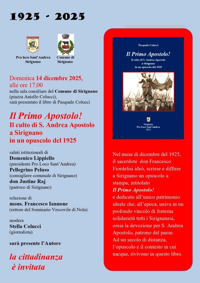 L’opera, dal titolo Il Primo Apostolo! Il culto di S. Andrea Apostolo a Sirignano in un opuscolo del 1925, si articola in quattro capitoli. L’autore compie un viaggio nella Sirignano degli anni Venti seguendo la linea tracciata da don Francesco Fiordelisi ne Il Primo Apostolo! Un opuscolo del 1925, di carattere religioso e devozionale ispirato alla vita di S. Andrea, patrono di Sirignano, che ci offre uno spaccato della società dell’epoca con i suoi protagonisti. Si tratta di una delle prime pubblicazioni a stampa diffuse a Sirignano.