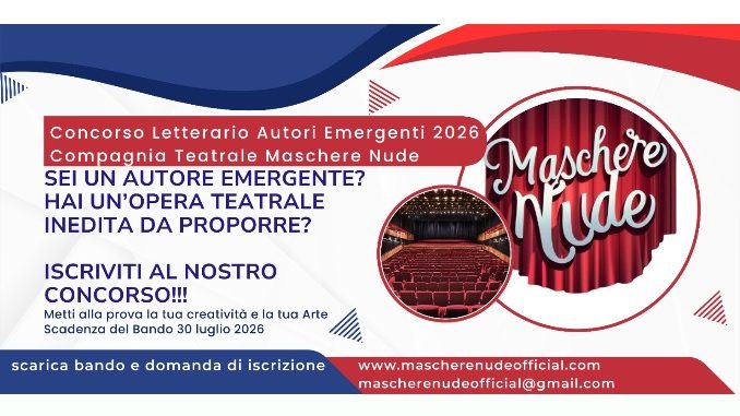 La Compagnia Teatrale Maschere Nude lancia il Concorso Letterario Autori Emergenti 2026, un’importante occasione dedicata a chi vive il teatro come vocazione, ricerca e urgenza espressiva. Un invito chiaro e appassionato rivolto a tutti gli autori emergenti che desiderano dare voce alle proprie idee attraverso un’opera teatrale inedita.