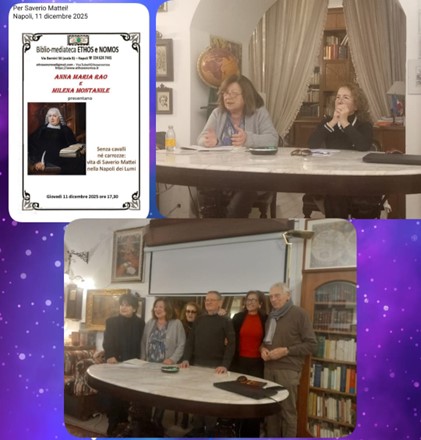 Una serata a Napoli ricrea sempre. Serata di spessore è stata quella presso la Biblio-mediateca ETHOS E NOMOS, in via Bernini, nel salotto letterario settecentescamente ricostruito della Madame Marisa Lembo, giovedì 11 dicembre 2025.