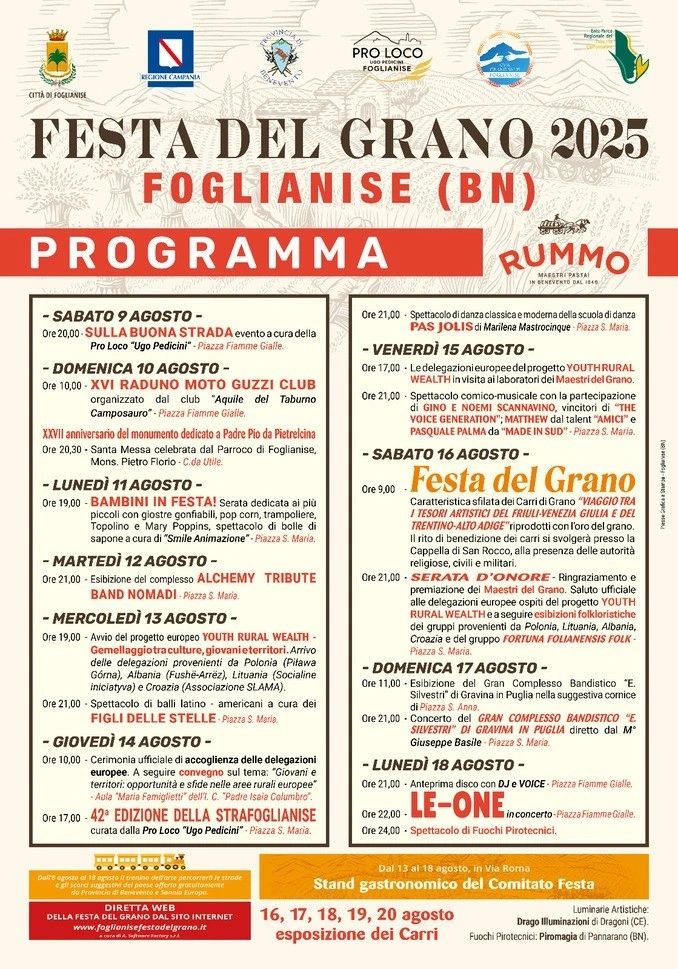 A Foglianise (BN) agosto ha il profumo del grano e il suono delle campane. La Festa del Grano 2025 ha acceso il Sannio per dieci giorni di riti, musica e arte contadina trasformata in spettacolo, con il paese addobbato come un set a cielo aperto e i Maestri del Grano al lavoro fino a notte fonda per intrecciare spighe e segni della devozione popolare. Il calendario ha abbracciato l’intero cuore di agosto, dal 9 al 18, con la consueta progressione che porta dalla preparazione dei carri alla grande esplosione di colori e farine del fine settimana, fino al congedo festoso dell’ultima sera. L’attesa, come sempre, si è concentrata sulla sfilata dei Carri di Grano del 16 agosto in onore di San Rocco, la processione spettacolare che attraversa via Roma e mette in movimento vere e proprie architetture effimere, interamente rivestite di paglia, chicchi e spighe. È un rito antico che intreccia identità e fede: la comunità ringrazia il santo pellegrino per i raccolti e rinnova un patto che qui si tramanda da secoli.