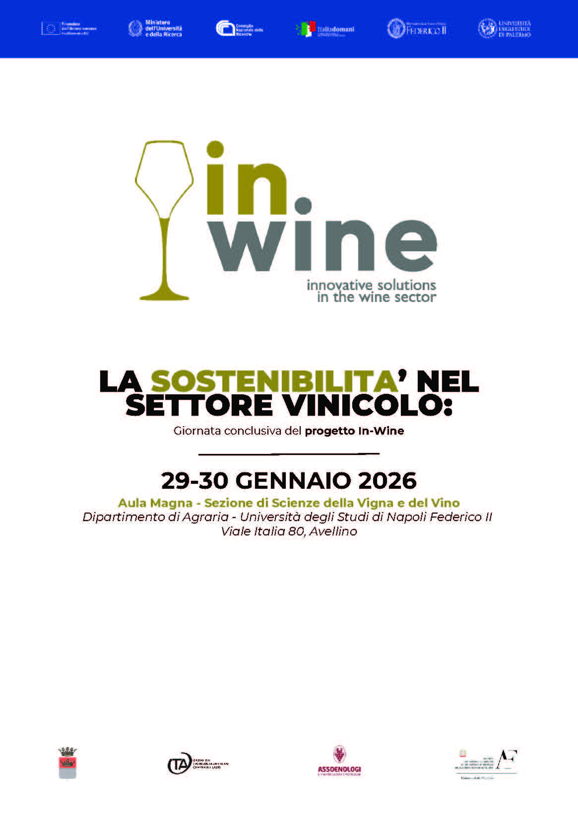 Il convegno “La sostenibilità nel settore vinicolo: giornata conclusiva del progetto IN-WINE” si terrà nei giorni 29 e 30 gennaio 2026 presso l’Aula Magna della Sezione di Scienze della Vigna e del Vino del Dipartimento di Agraria dell’Università degli Studi di Napoli Federico II, al Polo Enologico di Viale Italia 80, Avellino.