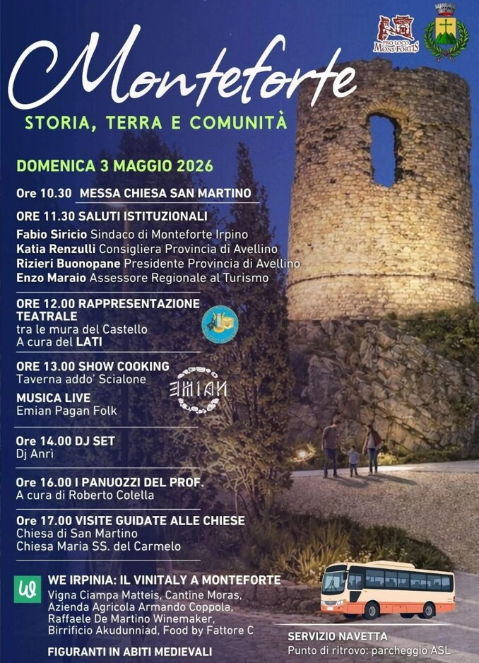 Domenica 3 maggio 2026 Monteforte Irpino ospiterà l’evento “Monteforte: storia, terra e comunità”, iniziativa dedicata alla promozione del patrimonio culturale e delle eccellenze locali. Il programma prenderà il via alle 10:30 con la celebrazione della messa presso la Chiesa di San Martino; alle 11:30 sono previsti i saluti istituzionali con la partecipazione delle autorità locali e provinciali.