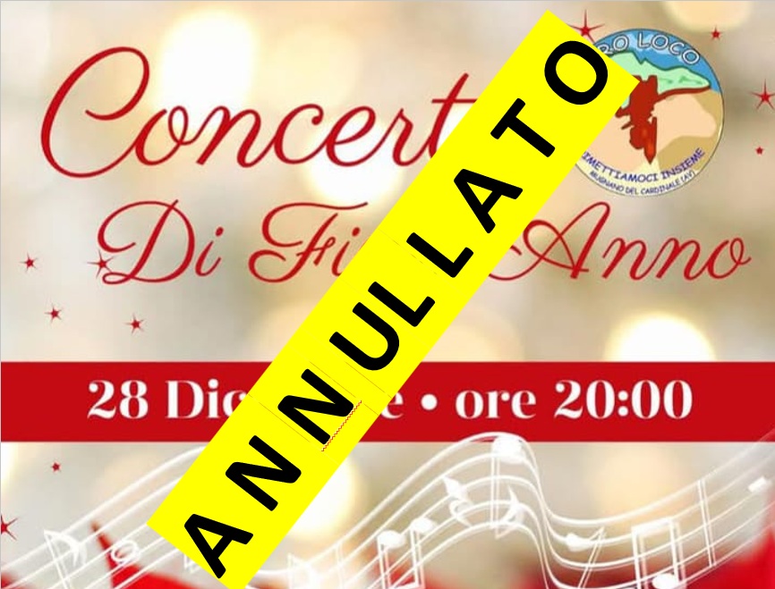 La Pro Loco “Rimettiamoci Insieme” di Mugnano del Cardinale (AV) comunica che il Concerto di Fine Anno, previsto per questa sera   alle ore 20:00 presso il Santuario di Santa Filomena, è stato annullato.
