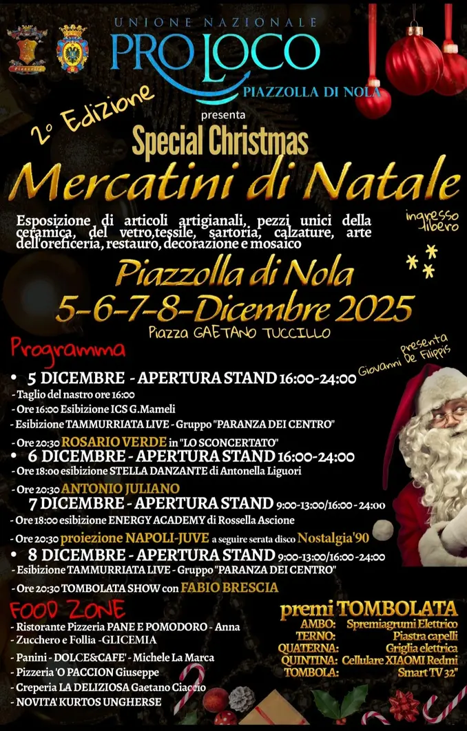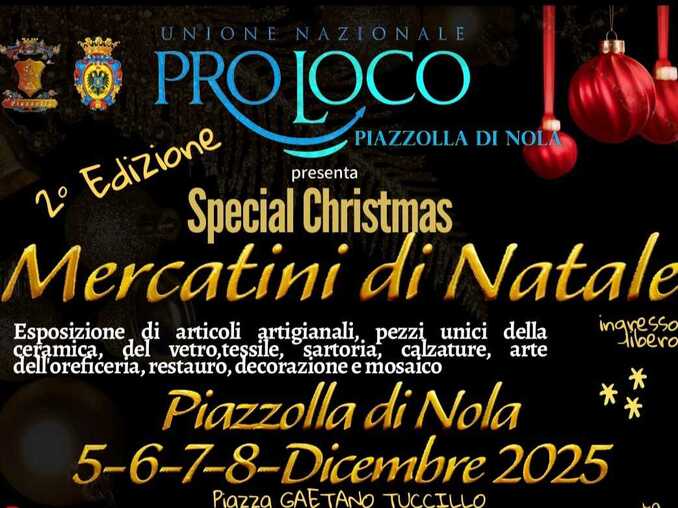 L’Unione Nazionale Pro Loco Piazzolla di Nola è lieta di annunciare la seconda edizione degli “Special Christmas Mercatini di Natale”, in programma dal 5 all’8 dicembre 2025 presso Piazza Gaetano Tuccillo, a Piazzolla di Nola. L’ingresso è gratuito.