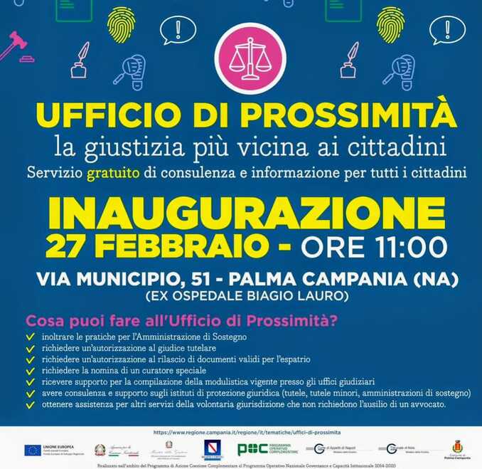 Il 27 febbraio, alle ore 11:00, sarà inaugurato il primo Ufficio di Prossimità della Campania, presso i locali dell’ex Ospedale Biagio Lauro in via Municipio a Palma Campania.
