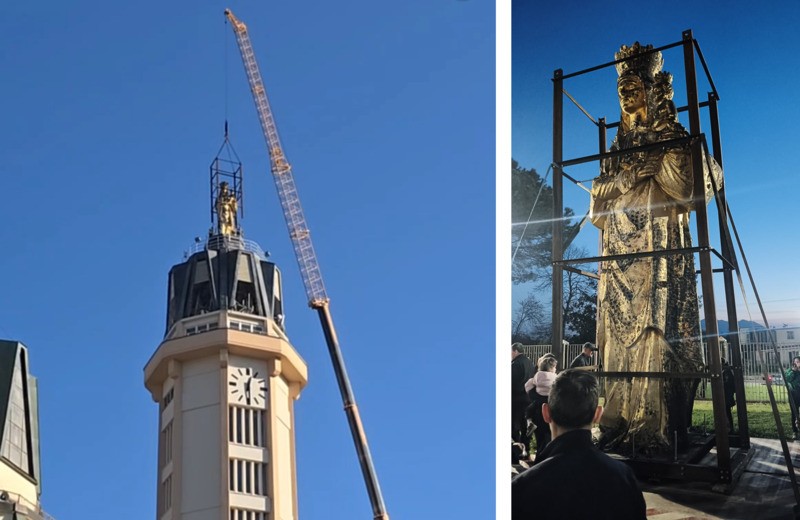 Sono ufficialmente iniziate le operazioni di restauro della statua della Madonna con il Bambino Gesù, collocata sulla sommità del campanile e da sempre uno dei simboli più cari alla comunità locale. La discesa della statua, è avvenuta oggi, con l’ausilio di una gru e sotto stretti protocolli di sicurezza, segna l’avvio di un intervento atteso e necessario. Installata nel 1987, l’opera ha resistito per quasi quarant’anni agli agenti atmosferici, ma oggi necessita di cure specialistiche per essere preservata e valorizzata.