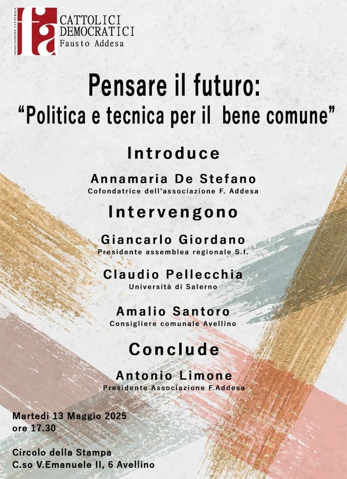 Martedì 13 maggio, alle 17.30, il Circolo della Stampa di Avellino ospiterà il convegno “Pensare il futuro: Politica e tecnica per il bene comune”, organizzato dall’Associazione Cattolici Democratici “Fausto Addesa”.
