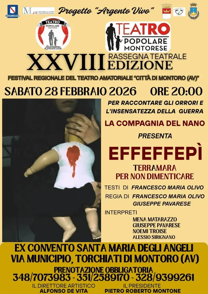 Anche il Teatro Amatoriale può dare un significativo contributo per la pace in Medio Oriente e nel Mondo intero. Sarà rappresentato, dalla Compagnia del Nano di Avellino, il lavoro scritto dal montorese, Francesco Maria Olivo, dal titolo: “EFFEFFEPI’ TERRAMARA PER NON DIMENTICARE”.