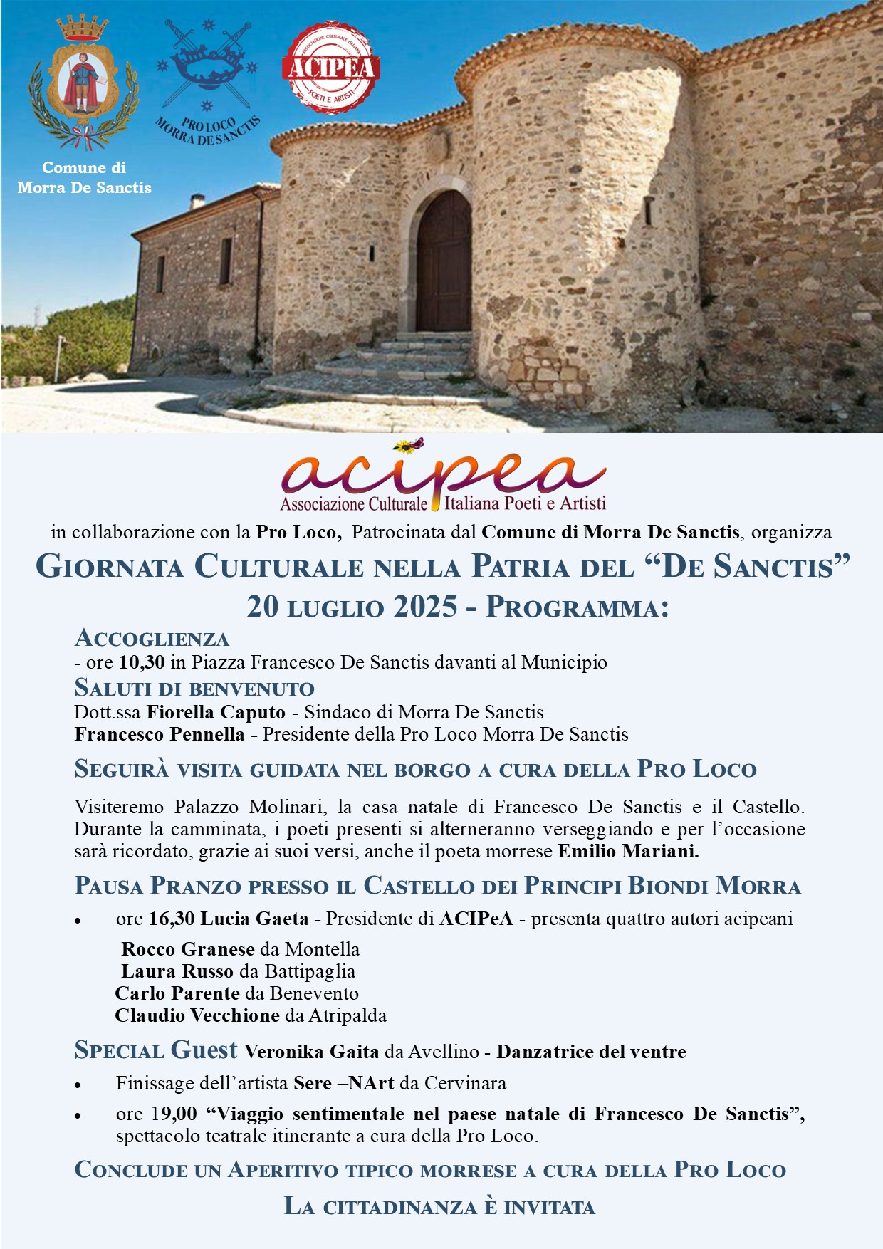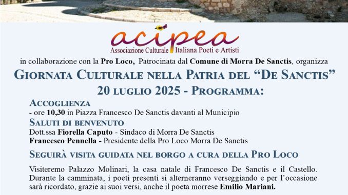 L’evento, organizzato da ACIPeA (Associazione Culturale Italiana Poeti e Artisti) e patrocinato dal Comune di Morra De Sanctis, in collaborazione con la Pro Loco, animerà l’intera giornata alla scoperta del borgo e dell’arte.