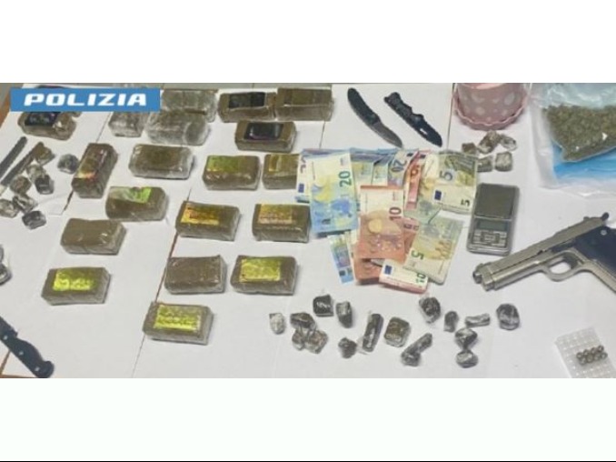 Il fiuto del cane antidroga ha infatti guidato gli agenti verso diversi punti dell’abitazione, dove sono stati rinvenuti oltre 2 chilogrammi di hashish, circa 40 grammi di marijuana, una pistola a salve con 8 cartucce, cinque coltelli, un bilancino di precisione e materiale destinato al confezionamento delle dosi, oltre a 205 euro in contanti suddivisi in banconote di vario taglio.