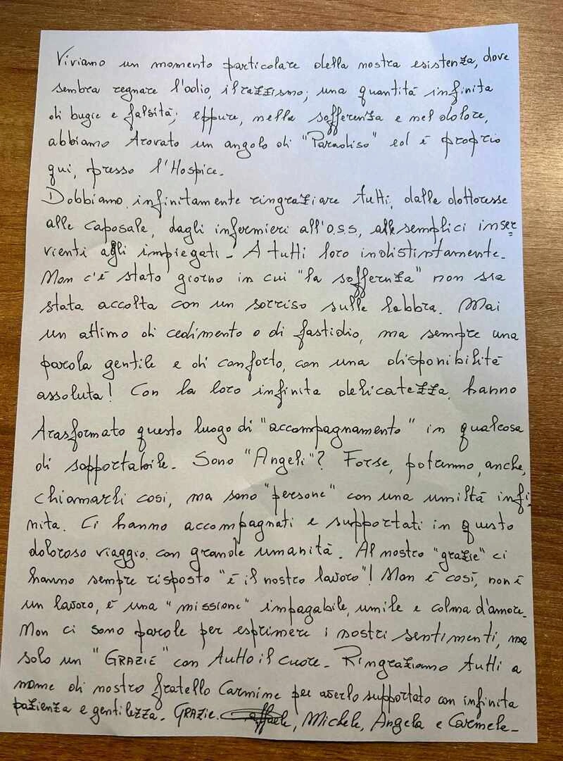 Una toccante lettera di ringraziamento della famiglia Troisi al personale dell’Hospice di Solofra