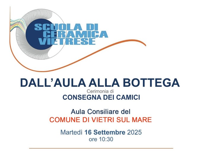 Un appuntamento speciale attende la comunità di Vietri sul Mare: martedì 16 settembre 2025, alle ore 10:30, presso l’Aula Consiliare del Comune, si terrà la cerimonia “Dall’aula alla bottega – Consegna dei camici”, un evento che segna il passaggio simbolico degli allievi della Scuola di Ceramica Vietrese dal percorso formativo in aula all’esperienza concreta nelle botteghe artigiane.