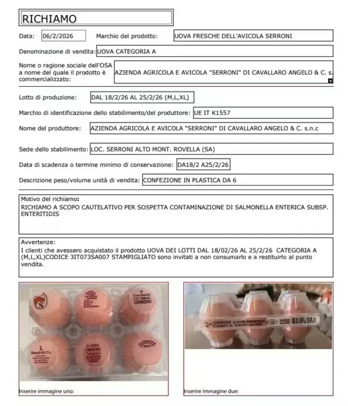 Le uova richiamate provengono dallo stabilimento dell’Azienda agricola e avicola Serroni di Cavallaro Angelo & C. s.n.c., situato in località Serroni Alto, a Montecorvino Rovella, in provincia di Salerno (codice UE IT K1557). L’azienda fa sapere di aver già ritirato dal mercato le confezioni ancora invendute, ma invita i consumatori che avessero acquistato prodotti con codice 3IT073SA007 e scadenze comprese nel periodo indicato a non consumarli e a riportarli al punto vendita per la sostituzione o il rimborso.