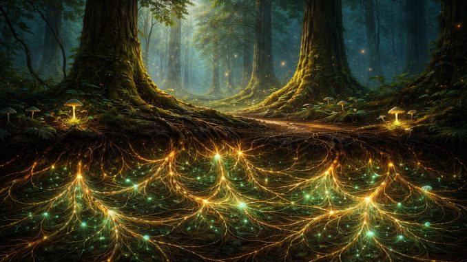 Camminando in un bosco, l’apparenza è quella di un luogo silente, quasi immobile, ma scavando sotto la superficie si svela un mondo sotterraneo complesso, fatto di micorrize, segnali chimici, competizione e cooperazione. Esistono reti micorriziche composte da filamenti di funghi che intessono connessioni tra radici diverse, creando i cosiddetti CMN, Common Mycorrhizal Networks, che – in alcuni casi – consentono il passaggio di acqua, nutrienti e molecole di segnalazione tra le piante. La narrazione mediatica dominante ha trasformato tutto in una sorta di “Internet della natura”, dove gli alberi si lanciano allarmi biochimici quando qualcosa minaccia il bosco, condividono risorse vitali e persino favoriscono i più giovani, quasi come un sistema di sostegno collettivo.