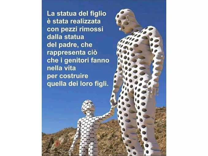 L’immagine di copertina di questo articolo, che rappresenta una scultura dell’artista  Chad Knigh,  rappresenta la figura di un adulto dalla quale sono stati rimossi i “pezzi” che poi compongono il piccolo. E’ una metafora potente: la genitorialità è un atto di trasferimento, e quei “pezzi” sono tempo, attenzione, regole, modelli emotivi — ma possono anche essere pezzi che il genitore sottrae al figlio se i confini si confondono.